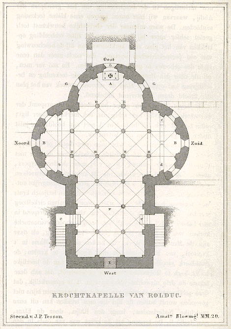 Lodewijk van Deyssel heeft kerstmis in zijn boek -de kleine republiek- ook beschreven. Zie hier een artikel over dat boek. U treft de beschrijving van kerstmis op blz 52 aan. Lodewijk was op Rolduc van 1875-1878. De crypte komt nog steeds overeen met de schets van Schaepkens, alleen is er extra de trap tussen de twee trappen naar het koor. | |