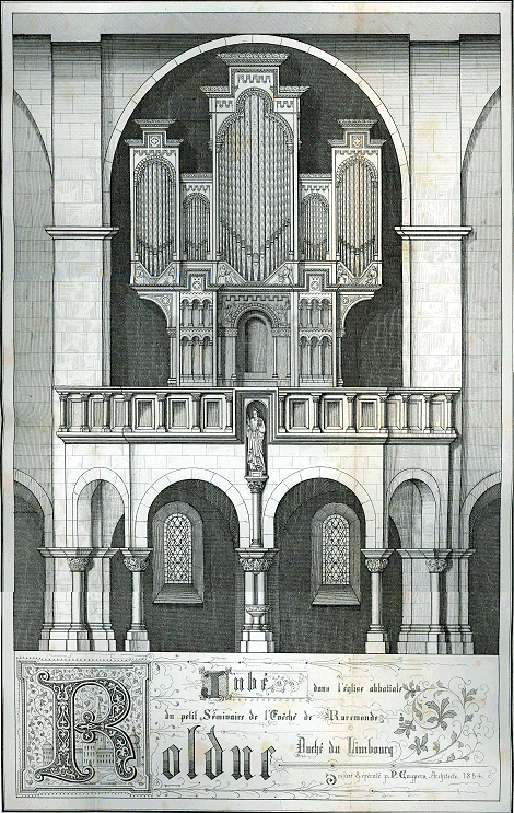 Als je de kerk van Rolduc binnenkomt..als je ze al binnenkomt, want meestal is ze nu gesloten ... dan zie je direct aan je rechterzijde een beeld van Cecilia met een orgel op haar linkerarm..welnu dat is een beeld uit het atelier van Cuypers....het orgel op haar arm is een model van het vroegere Müller orgel....zie op de linkerfoto waar het beeld van Cecilia vroeger stond...het Müller orgel dateert van circa 1854 ..het beeld zal ook wel uit die tijd stammen omdat het al getekend is op de afbeelding rechts ..onderaan staat daar 1854..
